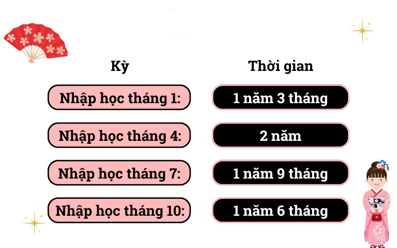 Thời gian học tại trường tiếng Nhật phụ thuộc vào trình độ ngôn ngữ ban đầu và kỳ nhập học. Mục tiêu là hoàn thành chương trình vào cuối tháng 3 để có thể nhập học đại học vào đầu tháng 4, đồng thời đảm bảo đạt được chứng chỉ N2 trước khi tốt nghiệp.